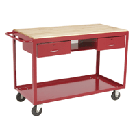 Height - Medium-Duty Work Table Industrial-grade work table with steel-reinforced oak deck top. • Industrial-grade work table with steel-reinforced oak deck top. • Size: 24"L x 48"W x 36"H. • Two steel drawers – 15 1 ⁄ 2"W x 5 1 ⁄ 2"H x 16 1 ⁄ 2"D. • 2 swivel, 2 rigid bolted-on soft rubber casters;5" x 1 1 ⁄ 4". Total lock brakes on swivel casters. • Frame colors: Red, Gray or Blue. • Model No. RMWB24485SRTP. - Not Adjustable Specify frame color when ordering. |